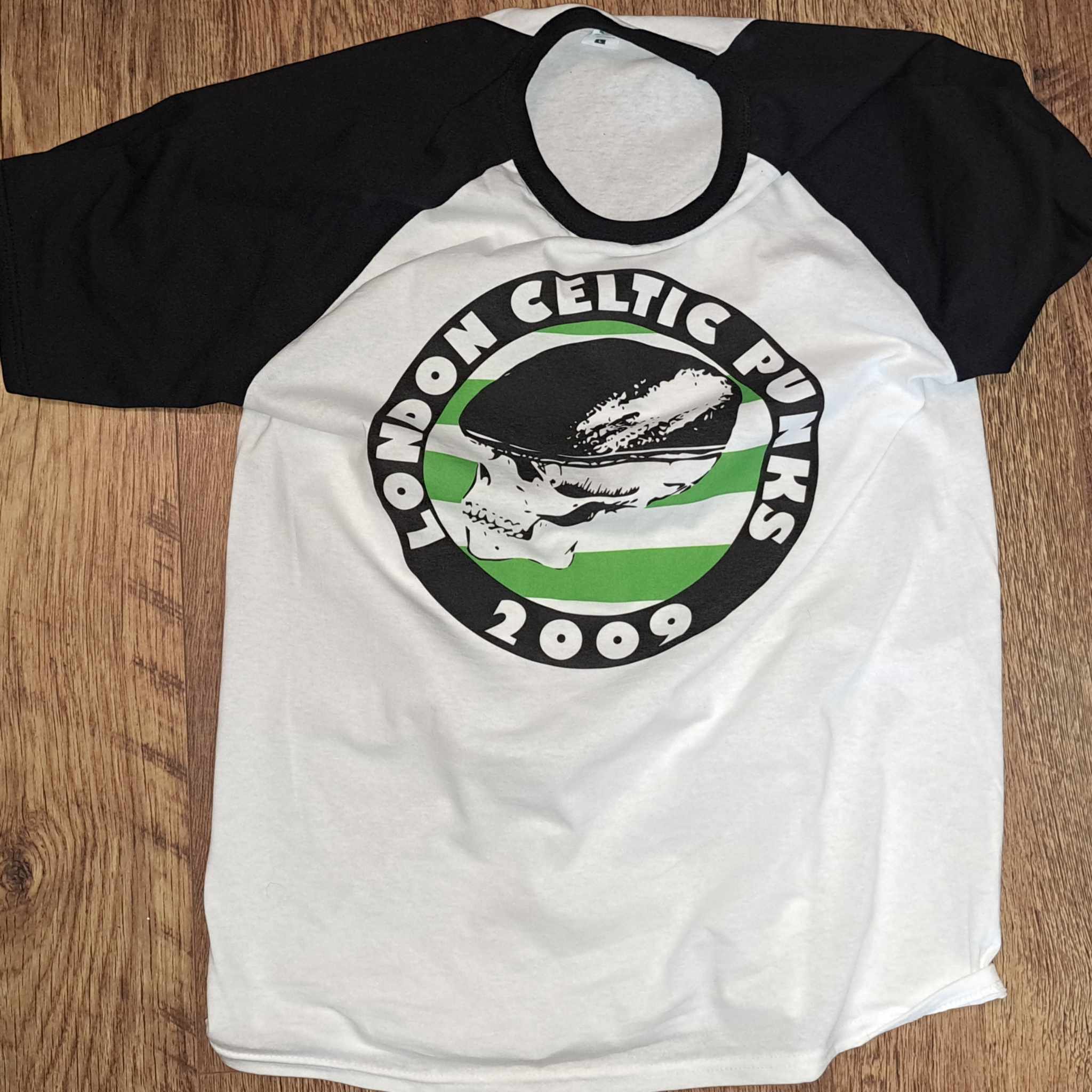 The Summer 2024 London Celtic Punks tee is now out. 2 colour print on white Fruit Of The Loom baseball shirt with black sleeves and collar