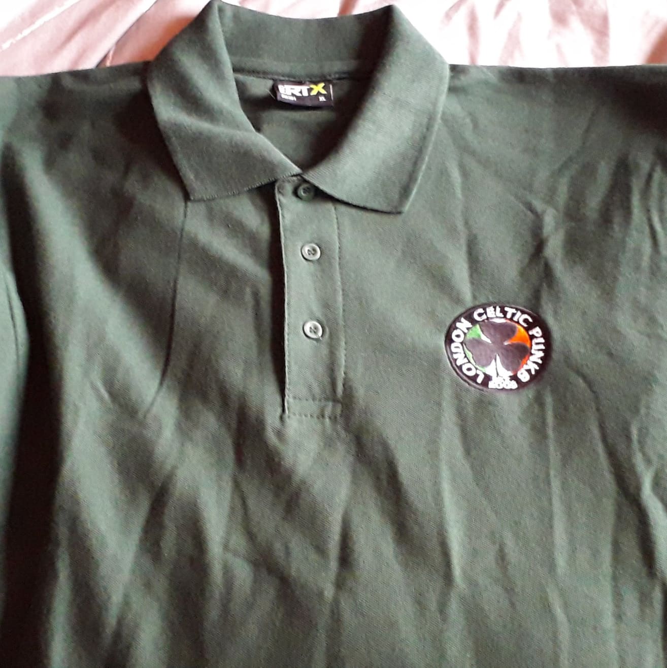 Lovely thick dark green polo shirt with the London Celtic Punks logo on the left breast in sizes from Medium to Extra-Extra-Large